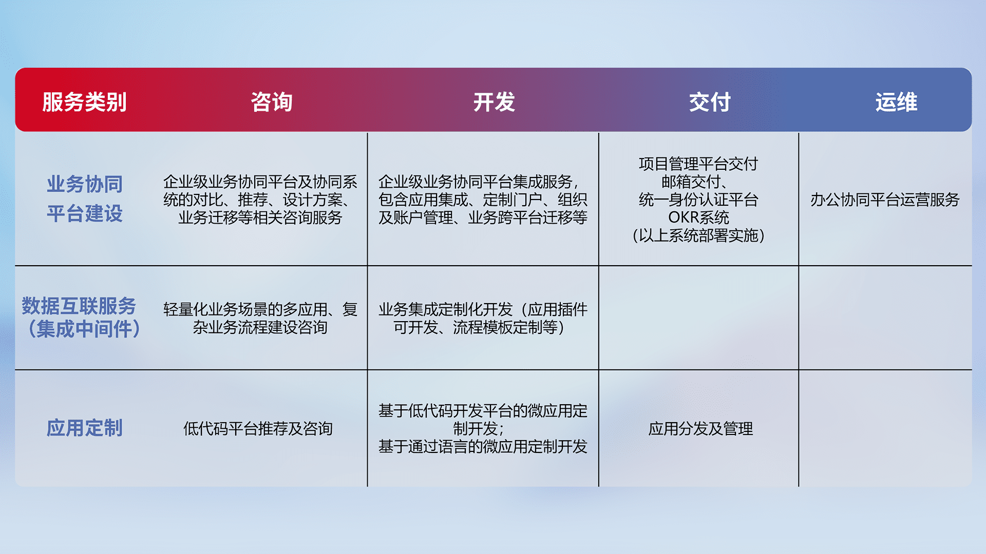 针对钉钉、、企微、、、IDaas等平台级产品提供产品的规划、、、方案、、、交付、、、定制化开发等服务,,,,实现如统一协同办公、、、智能客户服务、、、、混合会议管理、、、、智能数据查询、、、等业务场景,,实现数字化转型。。。。
